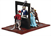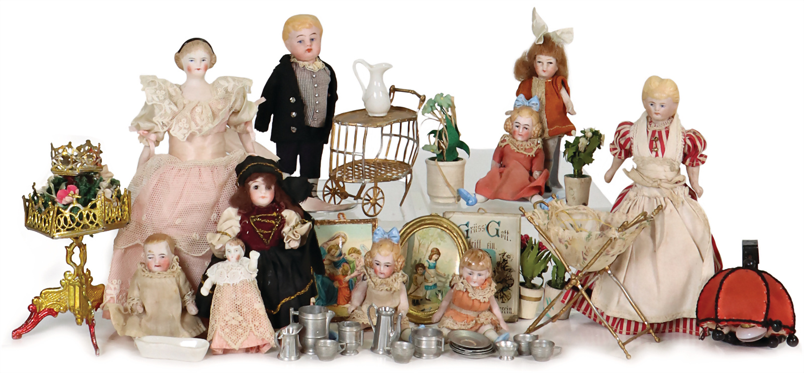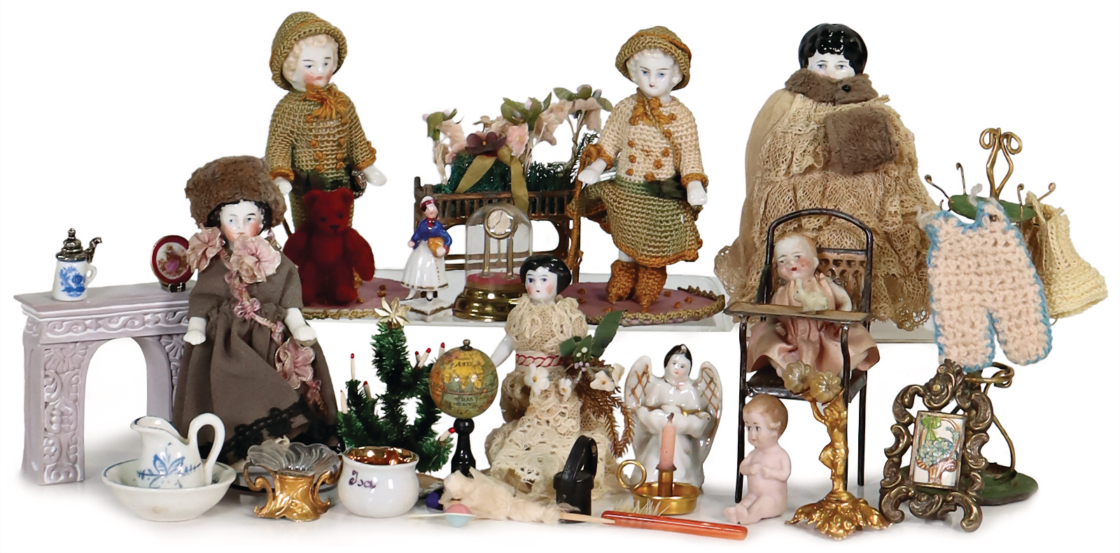 Puppenstuben-Ausschmückungsteile, 2 Damen, 13,5 u. 15 cm, Biskuit-Brustblattköpfe, -Arme u. -Beine, 1 Puppe mit anmodell. Haarreif, Kleidung neuer, 1 Puppe alte Kleidung, einige Puppenstuben-Kinder, Ausschmückungsteile, Provenienz: „ Sammlung Gerda Ott"