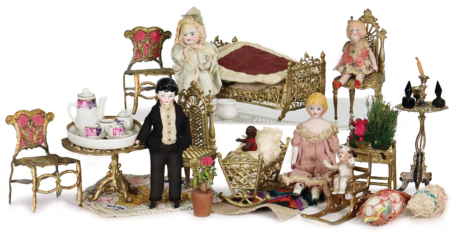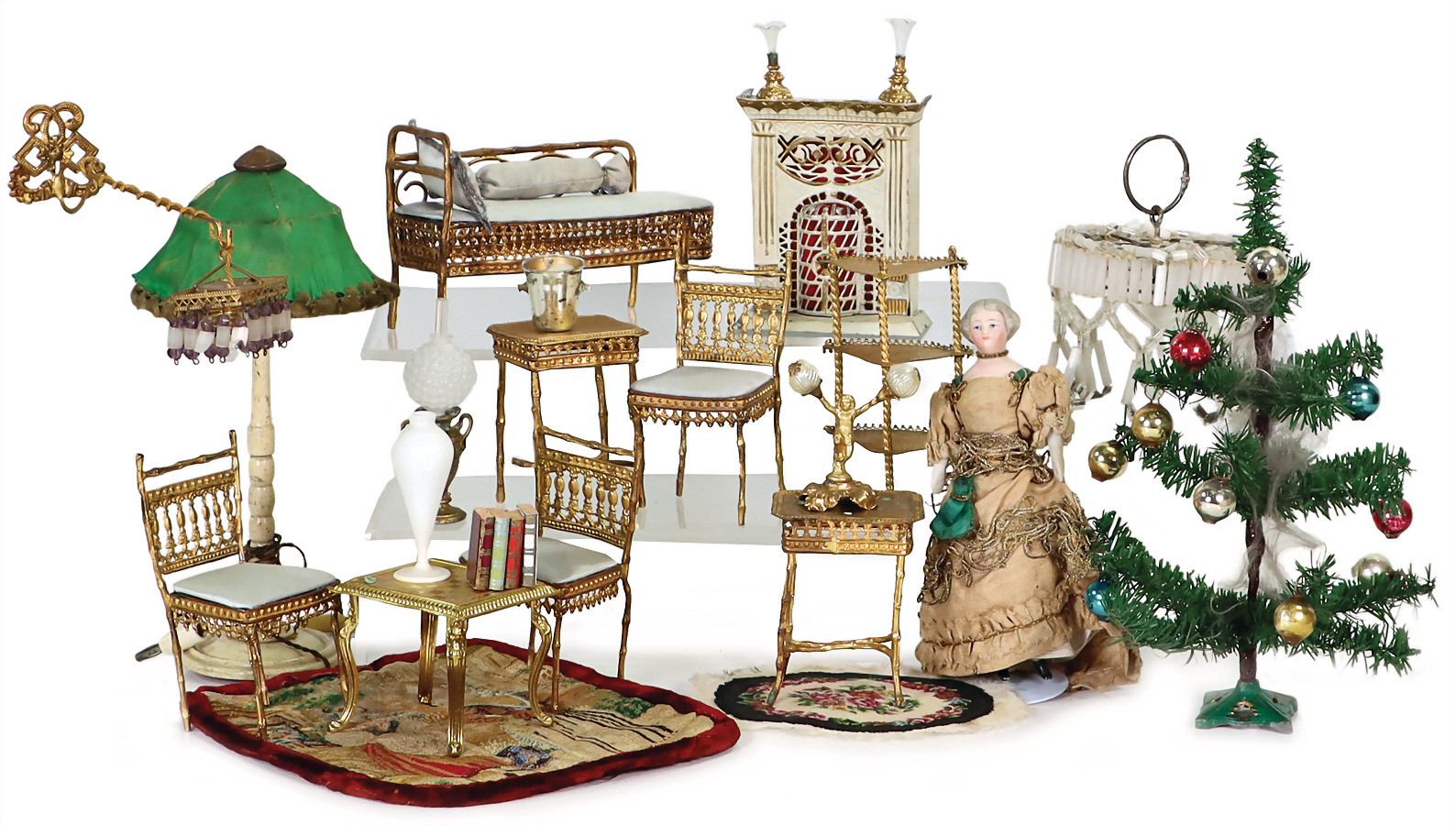 Messingblech, vergoldet, Puppenstuben-Möbel, Stühle, H: 10 cm, Recamière, 14 cm, Eckschrank, 2 Tische, Beistelltisch, dazu 1 Deckenleuchter Glas, Kamin Zinn, Puppenstuben-Puppe, ältere Dame, 14,5 cm, Biskuit-Kopf, -Arme u. -Beine, Stoffkörper, Stehlampe, Teppiche, kl. Weihnachtsbaum, Deckenleuchter, Messingblech vergoldet, Glasperlen montiert, mit Ausleger, Provenienz: „ Sammlung Gerda Ott"