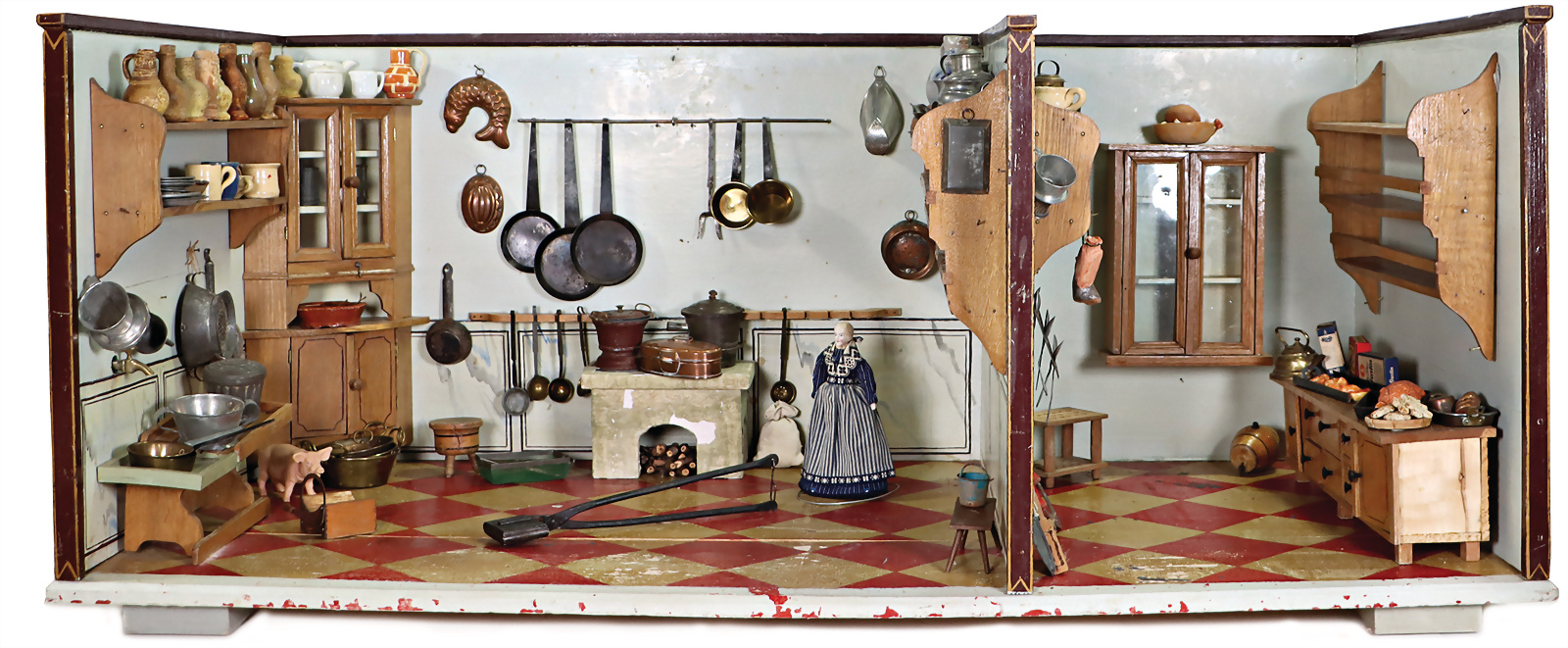 Rauchfangküche, B: 60,5 cm, H: 37 cm, T: 45,5 cm, Rauchfang, Regale, Brotschrank, Gänsestall, Seitenwände verzapft, Feuerstelle, Bemalung evtl. später, reichh. Zubehör aus untersch. Zeit, Provenienz: „ Sammlung Gerda Ott"
