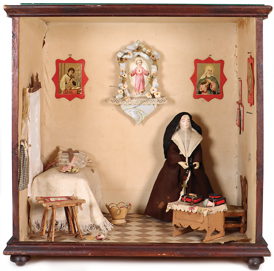 Puppenstuben-Nonnenstube, ca. 1880, in Kastenform, H: 40 cm, B: 40 cm, T: 27,5 cm, Puppe, Holz geschnitzt, 19 cm, Betstuhl, Gebetstisch, Provenienz: „ Sammlung Gerda Ott"