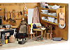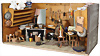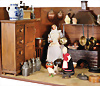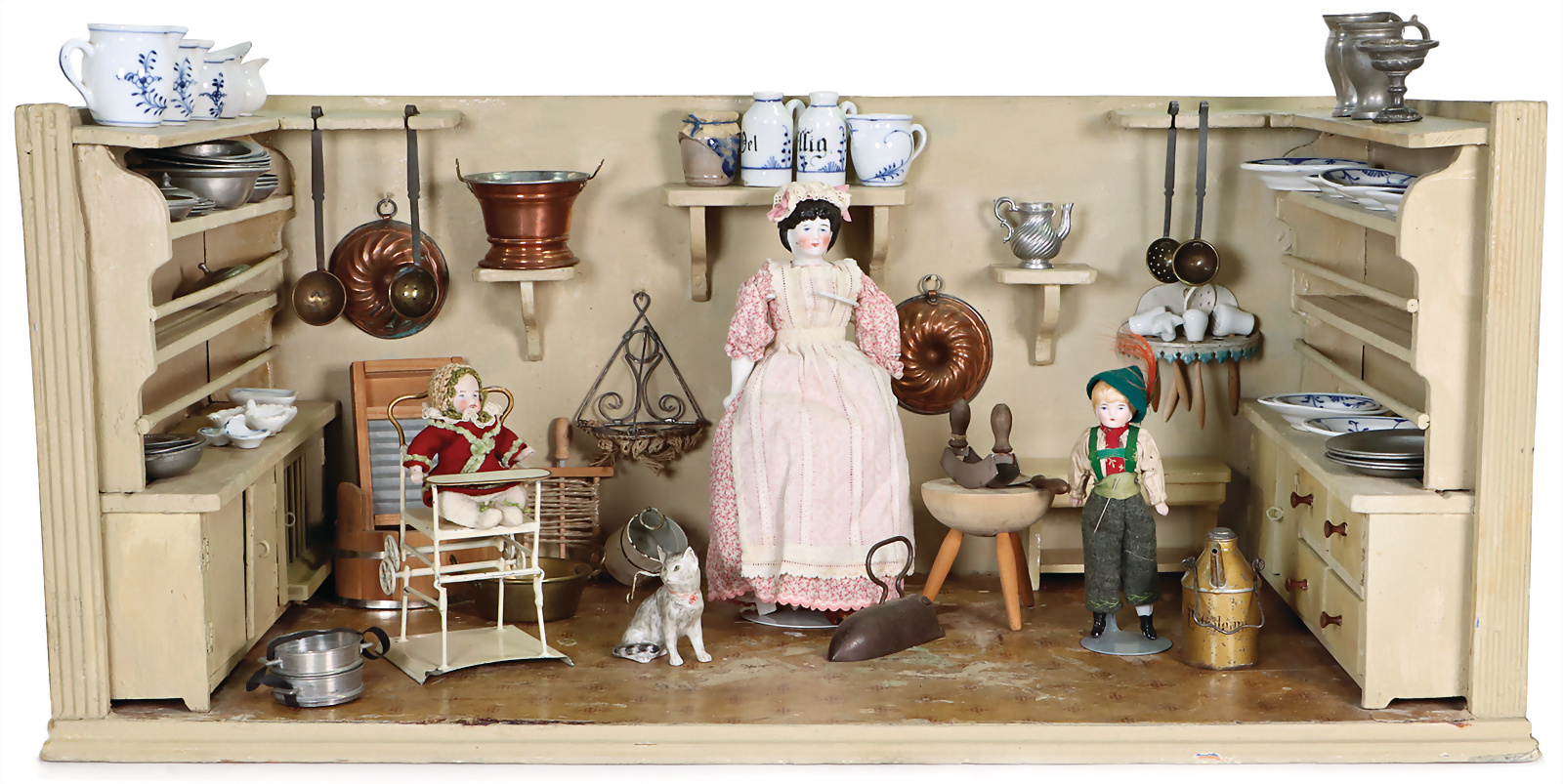 Puppenstuben-Küche, um 1900, mit Vorratskammer, B: 111,5 cm, H: 49 cm, T: 53 cm, möbliert, Eckschrank, Regale, reichh. Zubehör, möbliert mit Puppen, Transportaufwand beachten, nur an Selbstabholer, oder über Spedition verschickbar, alte Bemalung, dekorativ, Provenienz: „ Sammlung Gerda Ott"