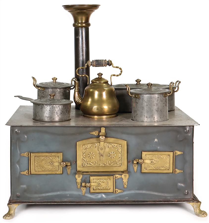Puppenküchenherd, um 1900, Blech, Türen Messing, Messing-Löwentatzenfüße, mit Topfsatz, Wasserschiff, Provenienz: „ Sammlung Gerda Ott"