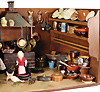 Kl. Puppenstuben-Küche, ca. 1880, B: 62 cm, H: 29 cm, T: 34,5 cm, Gänsestall, Seitenwände verzapft, Regale, Waschtisch, schöne, alte Bierlasur, reichh. Zubehör, mit früher GRÖDNERTAL Puppe, vorne fehlt wohl 1 kl. Stück an der Bodenplatte, Provenienz: „ Sammlung Gerda Ott"