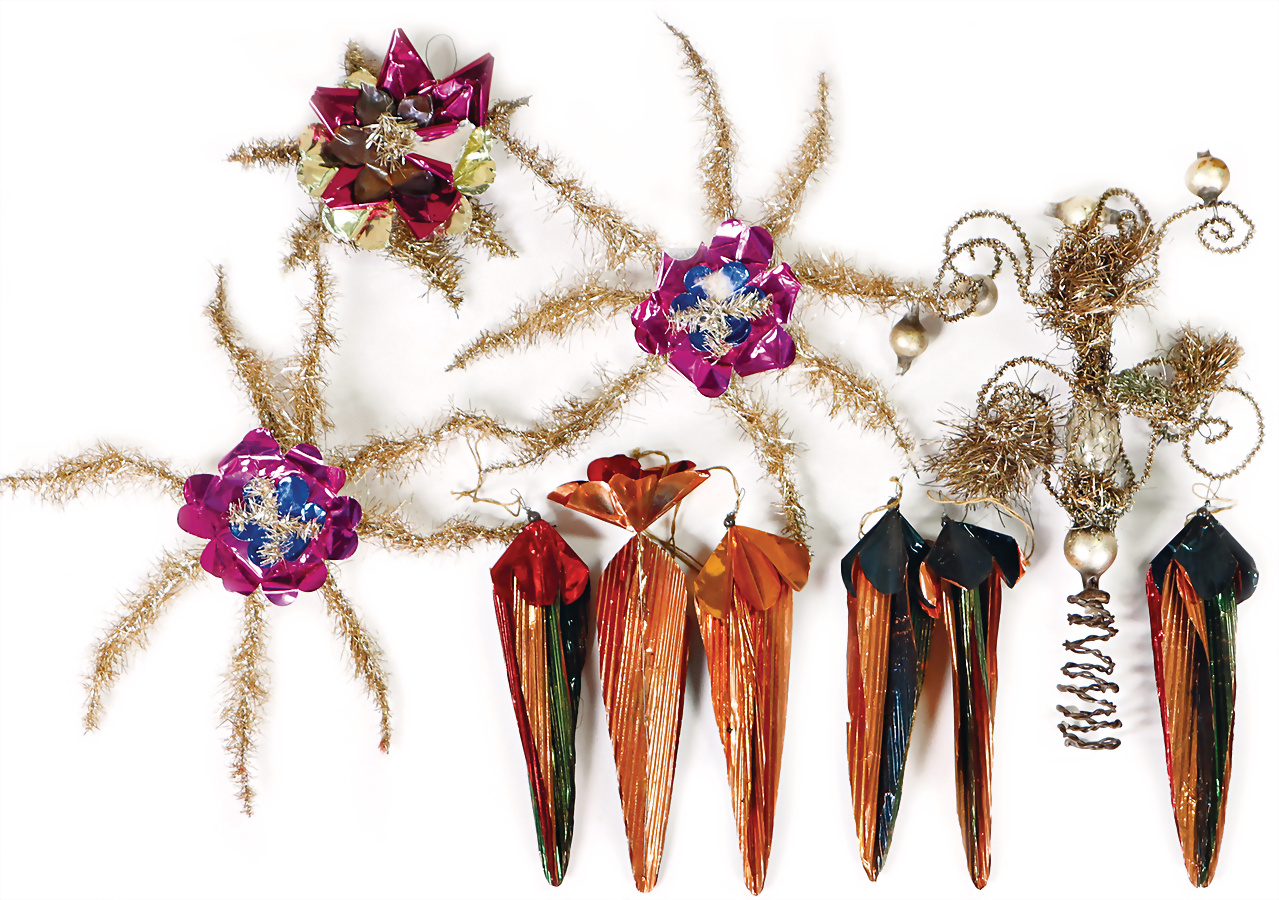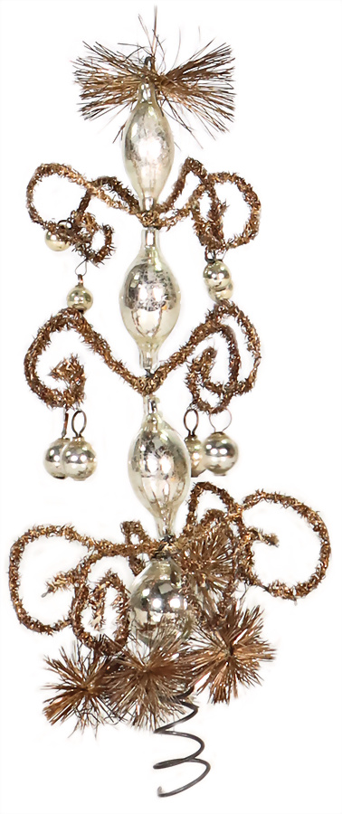 Christbaumschmuck, Stanniolpapier, Zapfen, 12 cm, Spitze, Glas mit Leonischen Drähten, Blüten, Sterne