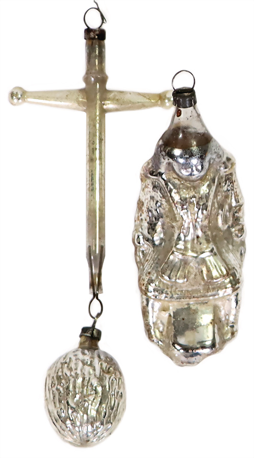 2 x Glaskugeln, 1 x Mädchen auf Schlitten, dazu 1 x Glas-Kreuz mit Nuss, 15 cm