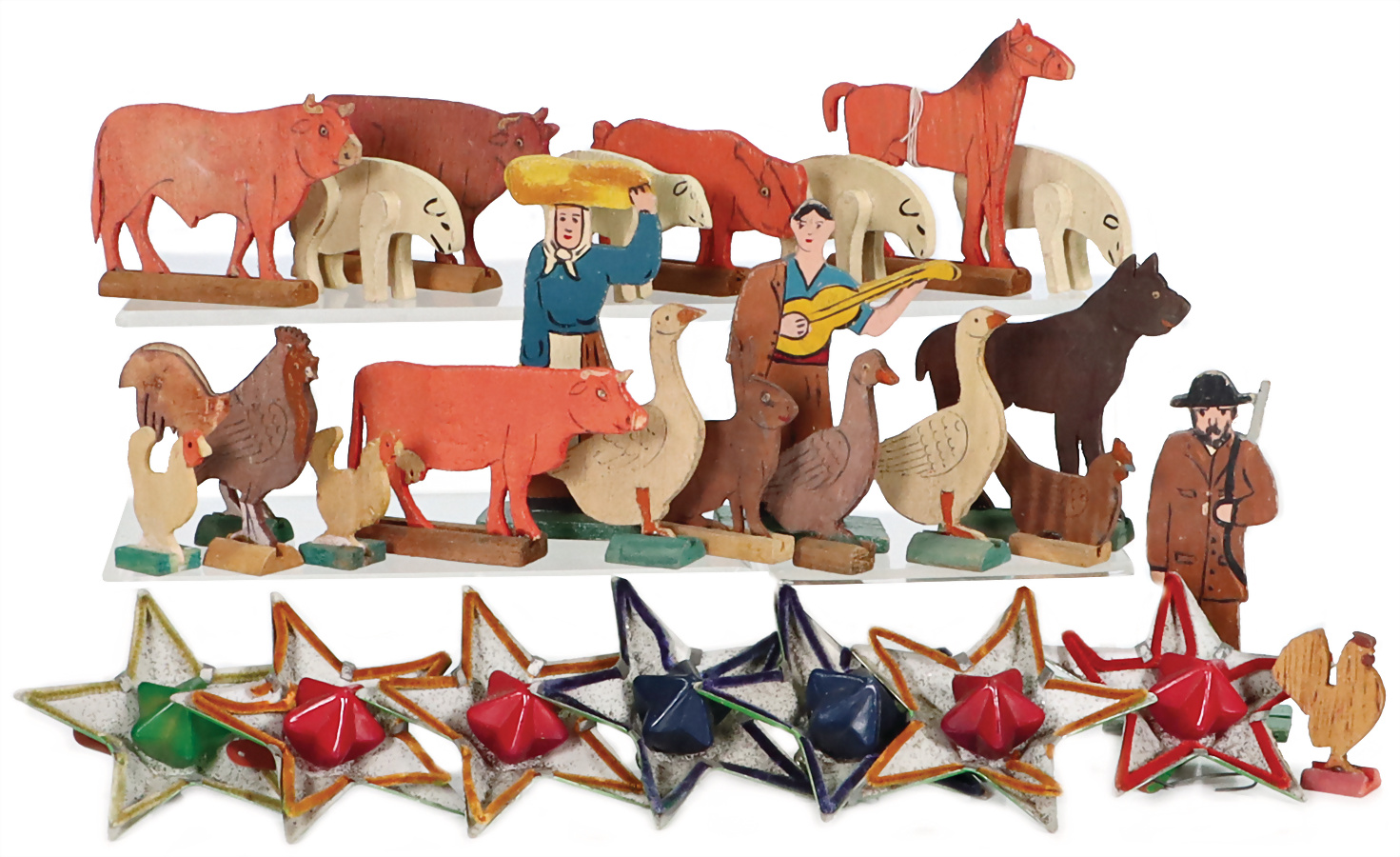 Konv. Christbaumschmuck, Kerzenhalter, Blech mit Klammer, 35 Teile, mit Krippe