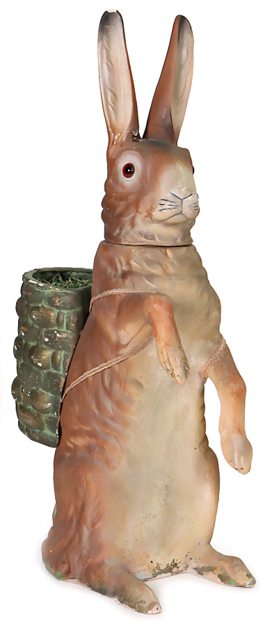 Candy-Container, Hase, aufwartend, Masse, mit Masse-Kiepe, Glasaugen, 43 cm, außergewöhnliche Gr., 1 Ohr geklebt