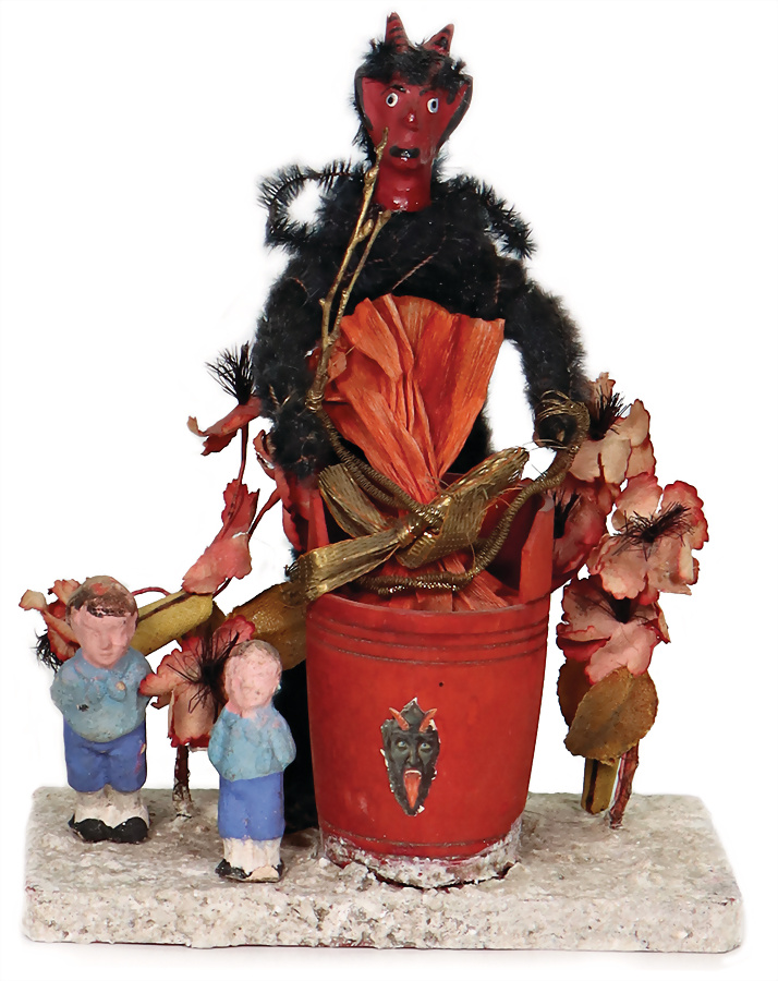 2 Teile, Weihnachtsschmuck, Wattefigur mit Kreppkleidung u. Schirm, Oblatengesicht, 9,5 cm, 1 Weihnachtsmann mit Baum, Chromolithographie, Glasschweifrock