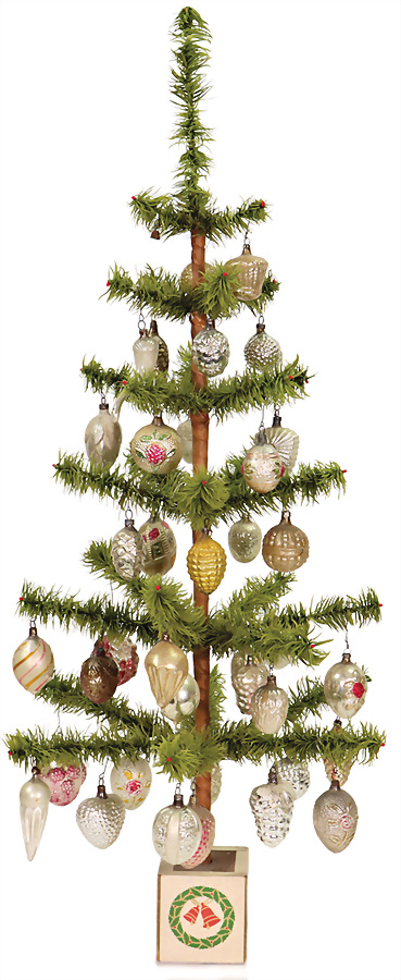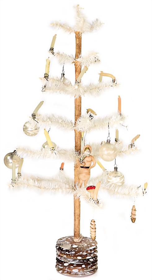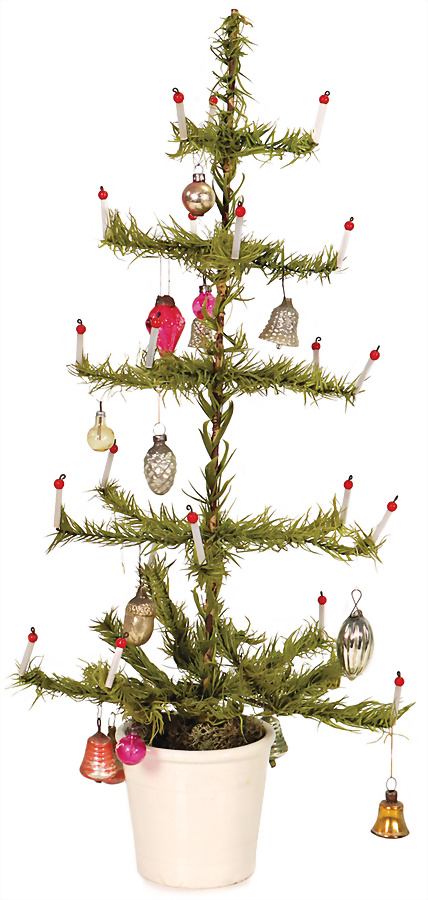 Federbaum, H: 63 cm, geschmückt mit Kerzen, Glaskugeln u. 1 Wattefigur