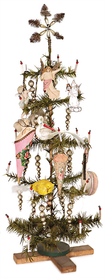 Federbaum, H: 60 cm, geschmückt mit Glas-, Porzellan- u. Pappeteilen, darunter 1 Candy-Container, Provenienz: „Sammlung Frohnwieser“