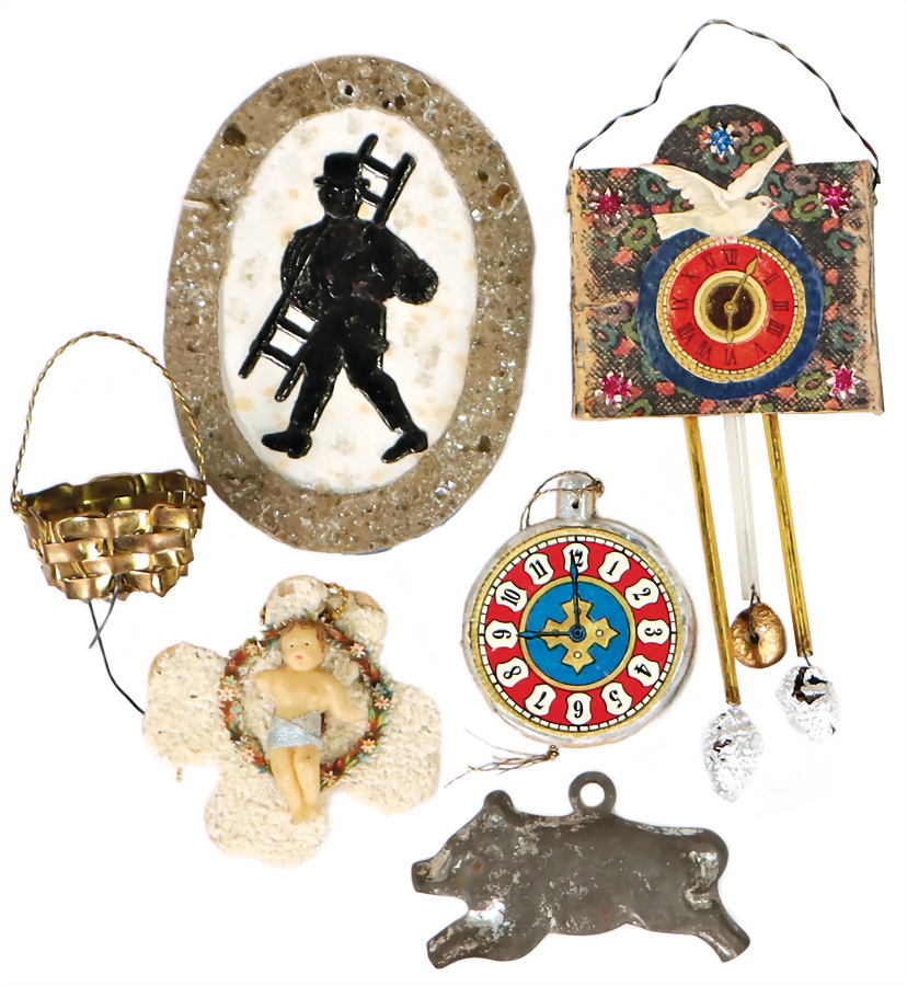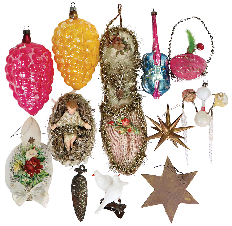 Christbaumschmuck, Glas, Zapfen, Geige, Früchtekorb, Leuchter, 1 Engelskind, Wachs, Sterne, 2 Tauben, Milchglas auf Klammer