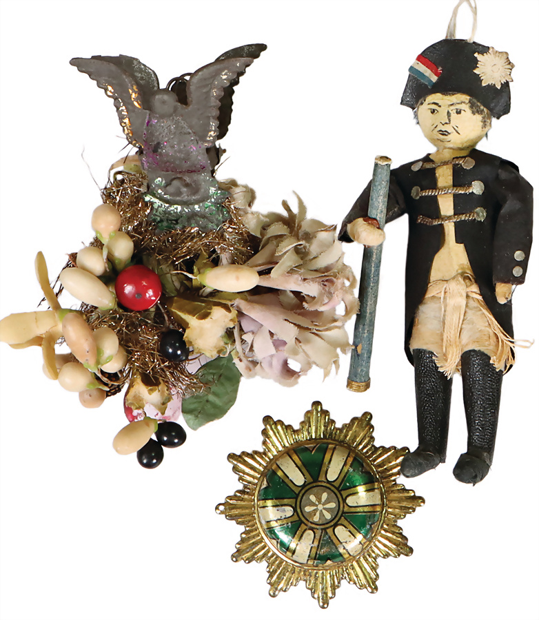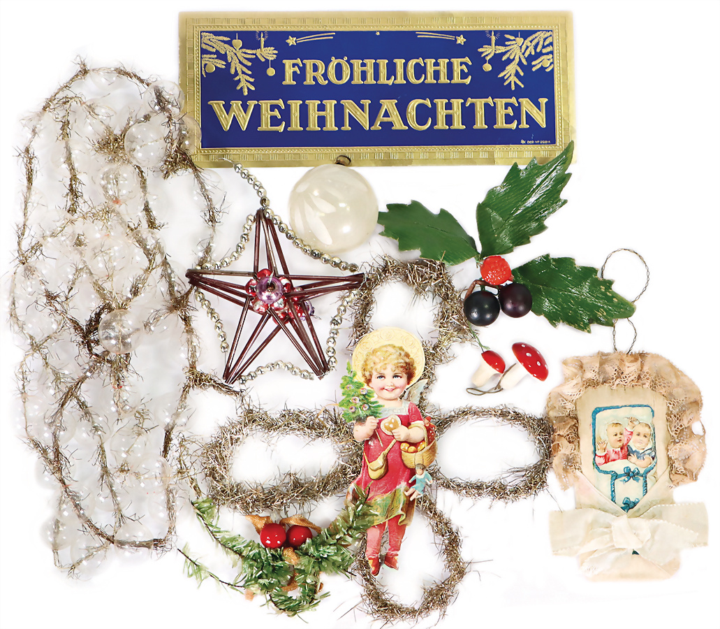 Christbaumschmuck, Steckkissen mit Zwillingspaar, beide mit Chromolthographie, Stern mit Chromolithographie, leonische Drähte, Kette mit Glaskugeln u. leonischen Drähten, 1 Stern Gablonz, Schild, Golddruck geprägt, Fröhliche Weihnachten, 2 Zweige
