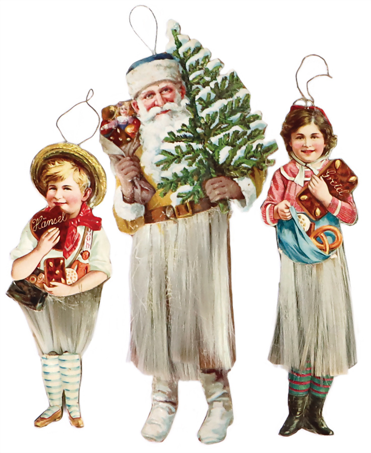 Christbaumschmuck, Weihnachtsmann, Chromolithographie, mit Weihnachtsbaum u. Geschenken, Glasschweifrock, H: 18 cm, 2 Kinder (Hänsel & Gretel, Chromolithographie, Glasschweifrock