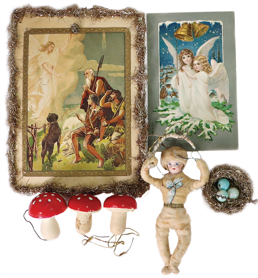 Christbaumschmuck, Watte, Kind mit Biskuitkopf, 12 cm, Korb mit Glaskugeln, Weihnachtskarte, Engelsbild mit Tinsel umrandet, H: 19 cm, 3 Wattepilze