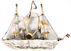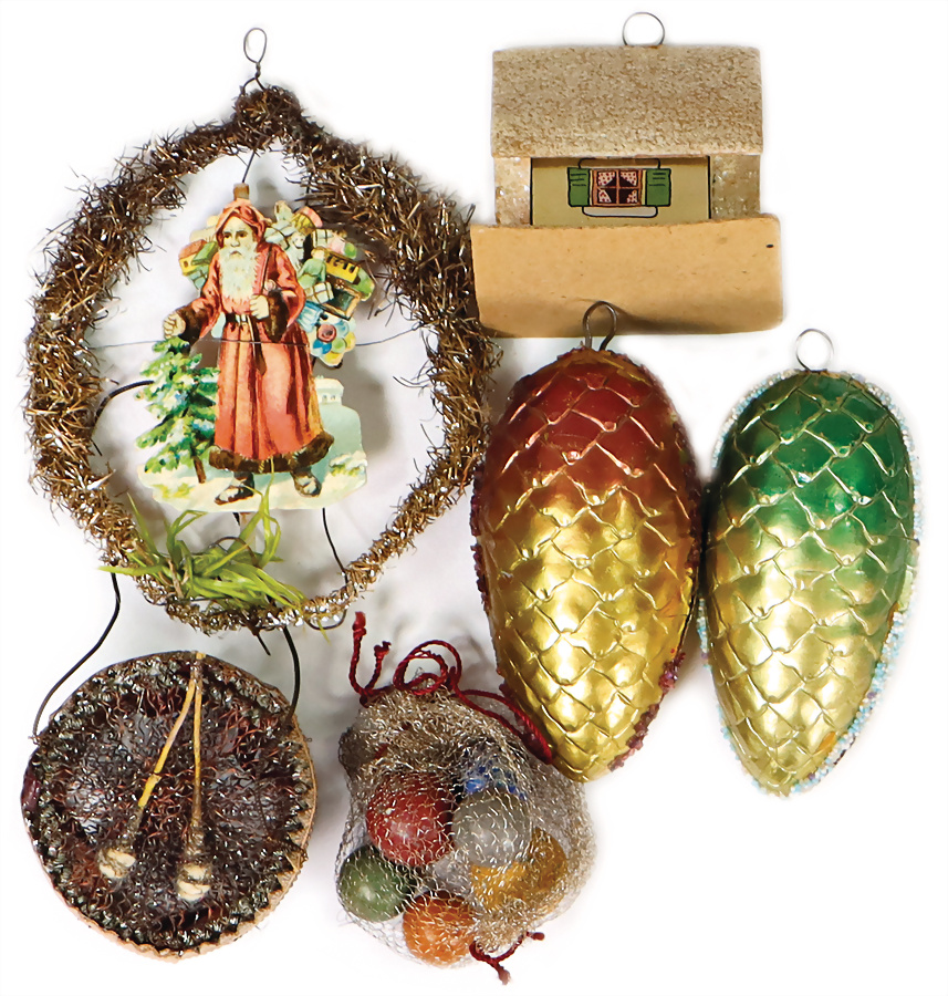 Christbaumschmuck, Kugelnetz, kl. Trommel, 2 Zapfen, Pappe, Kranz mit Oblatenbild