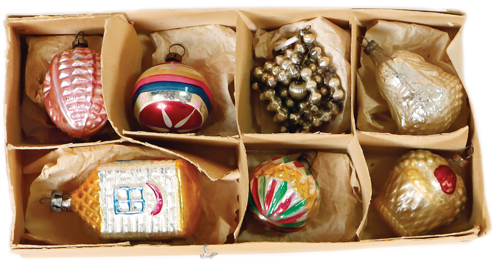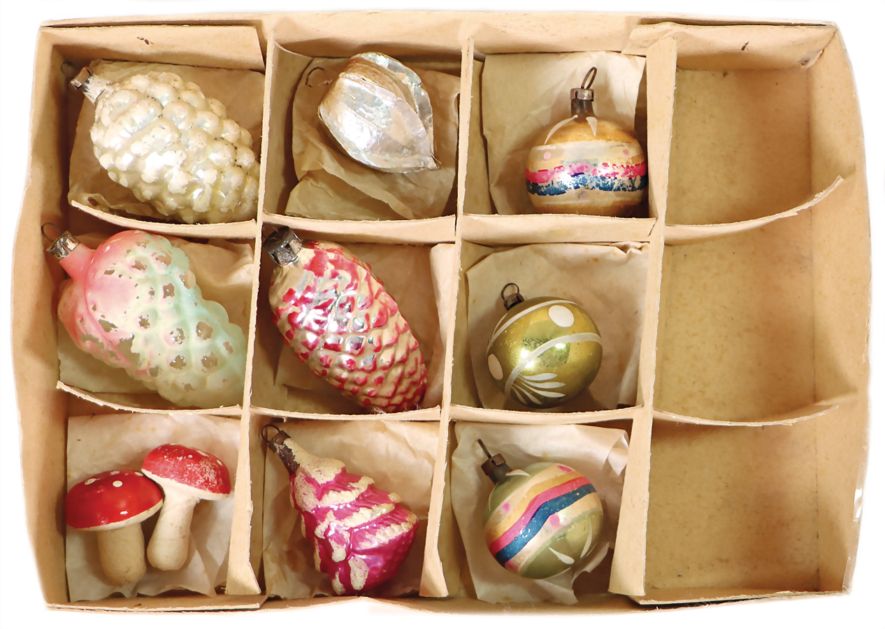 Christbaumschmuck, Glas, 12 Teile, Kugeln, Reflektorkugel, Kugel mit Früchtekorb, Engelsgesicht, Zapfen, Schuh
