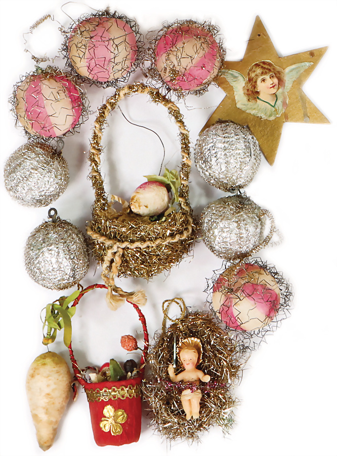 Christbaumschmuck, 4 Kugeln Silberpapier, mit Leonischen Drähten, 1 Stern Pappe, Wachskind, 2 Körbchen, 4 Kugeln, Wachs umwickelt mit leonischen Drähten