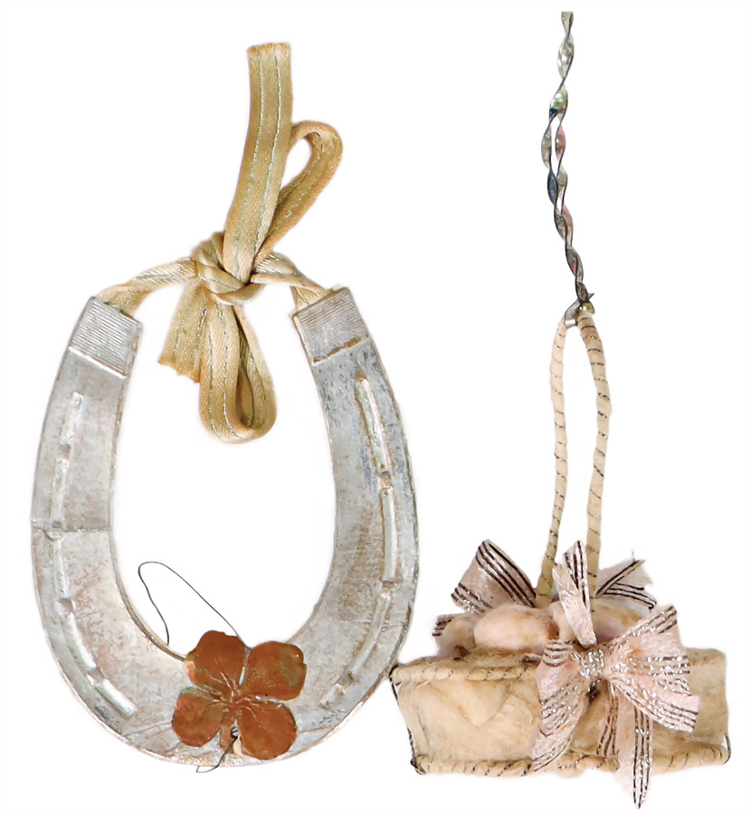 Christbaumschmuck, Hufeisen mit Kleeblatt, 8,5 cm, Korb mit Eiern