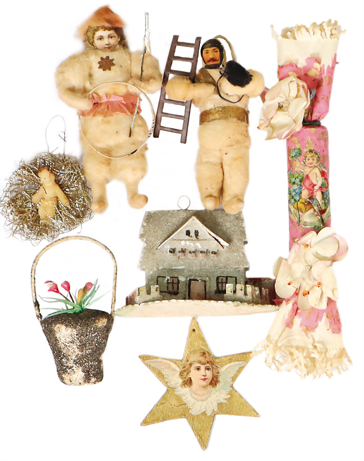 Christbaumschmuck, 2 Teile, Watte, Schornsteinfeger, 9,5 cm, Kind mit Reif, Korb, Stern, 1 Häuschen, Pappe, 1 Knalltüte