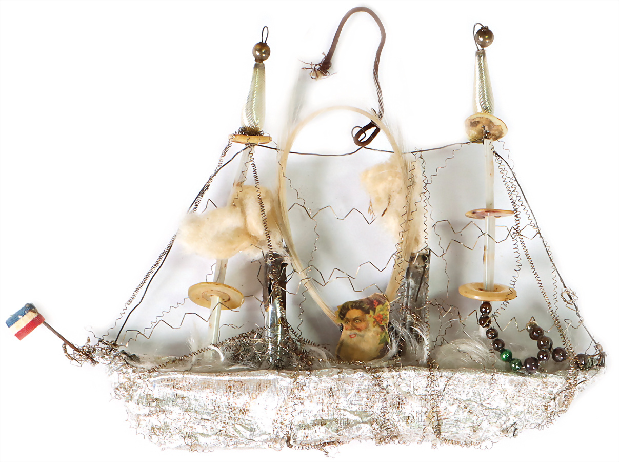 Christbaumschmuck, SEBNITZ, Ozeandampfer, 2 Masten, 2 Schornsteine, L: 15 cm, Watte, Stanniolpapier, Leonische Drähte / Glas