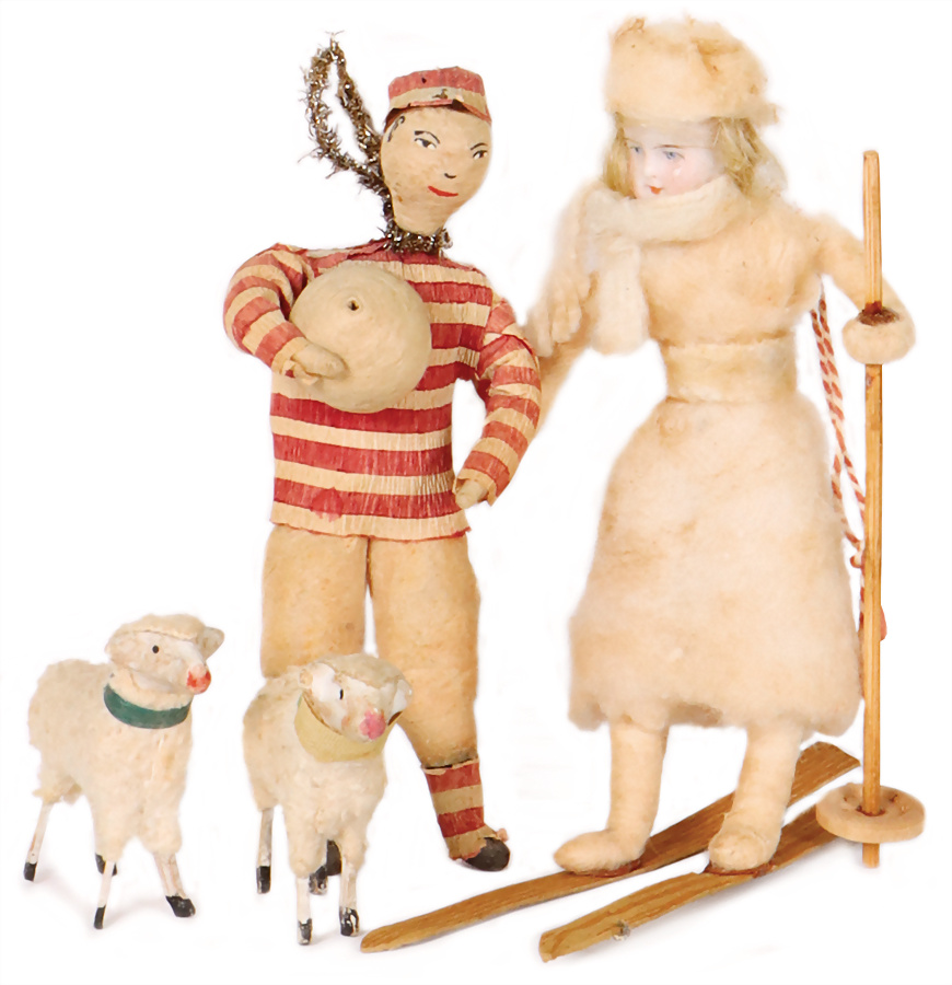 Christbaumschmuck, Mädchen auf Skiern, 13 cm, Watte, Biskuit-Kopf, 1 Skistock fehlt, Junge mit Ball, 13,5 cm, 2 Wollschafe