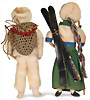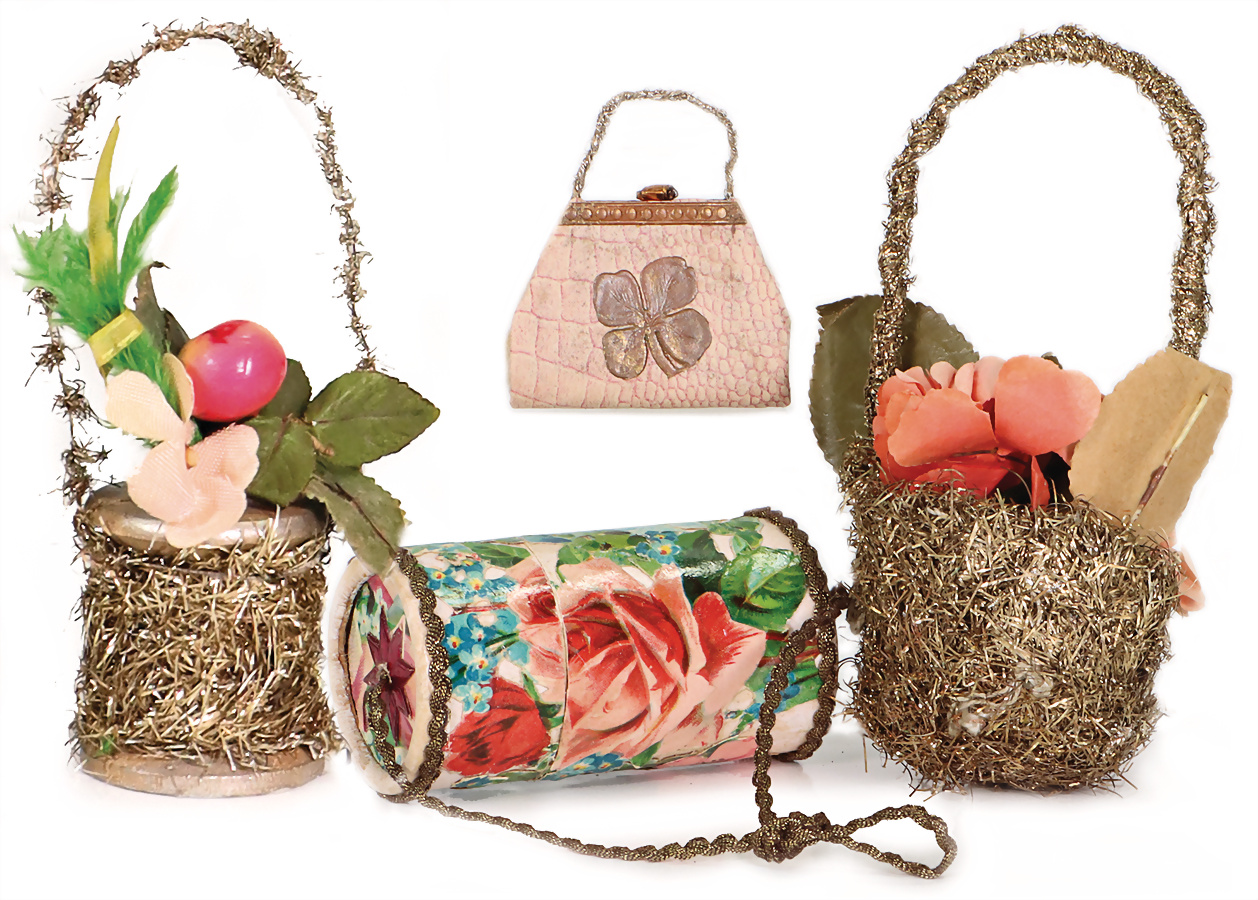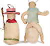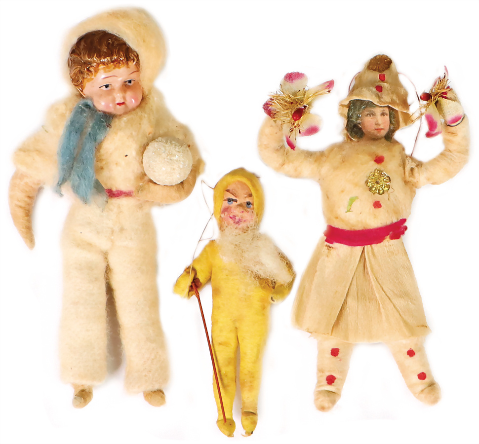 3 Teile, Christbaumschmuck, Watte, mit Blumen, Oblaten-Gesicht, Krepp-Rock u. –Hut, Kind mit Blumen, Oblaten-Gesicht, Kind mit Krepp-Rock u. –Hut, 13 cm, Zwerg mit Masse-Gesicht, 9,5 cm, Mädchen mit Ball, Kopf Celluloid