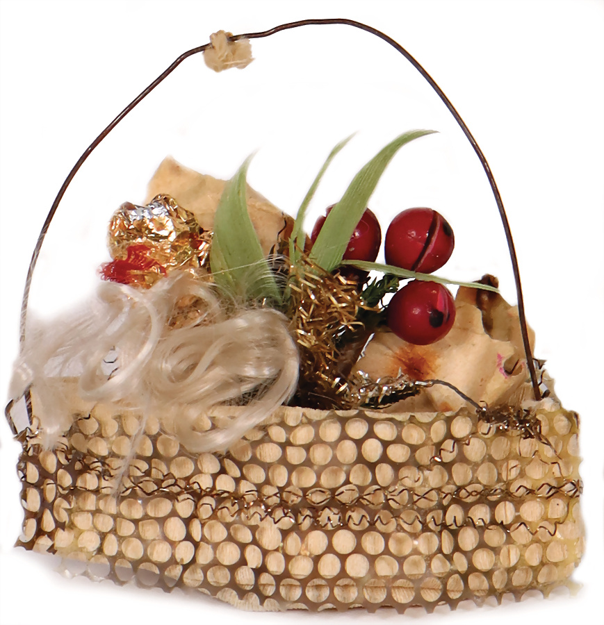 Christbaumschmuck, Blumenkorb, SEBNITZ, 7 cm, Lochblech, Watte, Leonische Drähte
