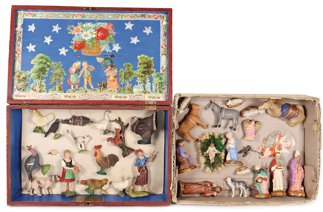 Masse, Krippen-Figuren, mit Tieren, 1 x Koffer, innen mit Oblatenbildern, Masse-Figuren
