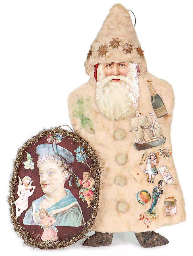 Christbaumschmuck, Watte-Figur, Weihnachtsmann, 40,5 cm, mit Oblaten-Gesicht, sowie Oblaten-Geschenke auf dem Mantel, 1 x Oblaten-Gesicht zum Aufhängen, Junge