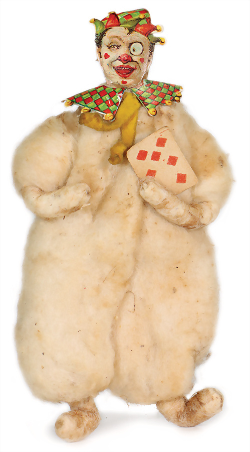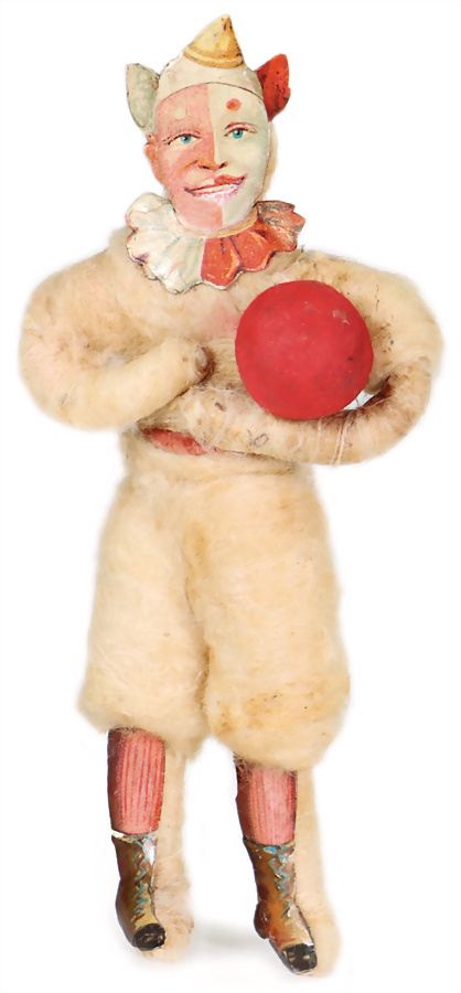 Christbaumschmuck, Watte, Clown, mit kleinem rotem Watte-Ball, Oblaten-Gesicht und Stiefel