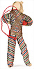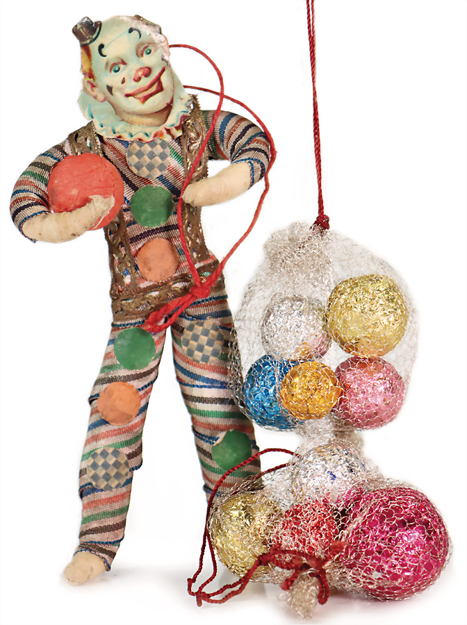 Christbaumschmuck, Watte, Clown, Oblaten-Gesicht, mit kleinem rotem Watte-Ball, 13 cm, aufwendig mit Seidenband ummantelt, dazu kl. Säckchen mit Stanniolkugeln