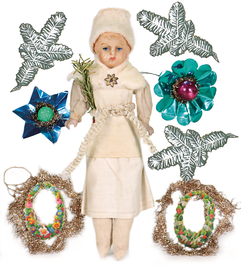 Christbaumschmuck, 1 x Celluloid-Kopf-Weihnachts-Puppe, 21 cm, 2 x Oblaten-Bilder mit leonischen Drähten, 3 x Papp-Tannen-Äste, Stanniol-Stern & Blume