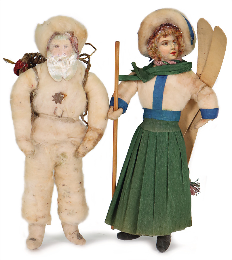 Christbaumschmuck, Watte, 2 x Teile, Weihnachtsmann mit Oblaten-Gesicht, 1 x Mädchen mit Ski, Kreppkleidung, 15 cm