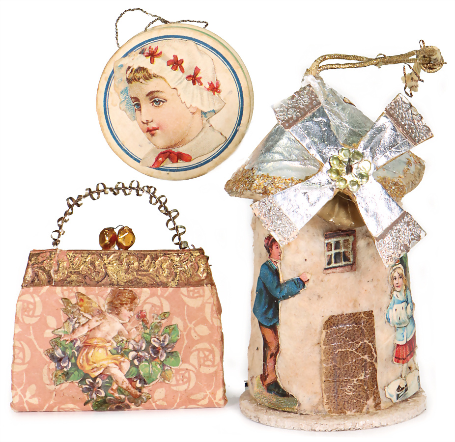 3 Teile Christbaumschmuck, Watte, Mühle, 8 cm, 1 x Papp-Tasche, kleine runde Dose mit Oblaten-Gesicht