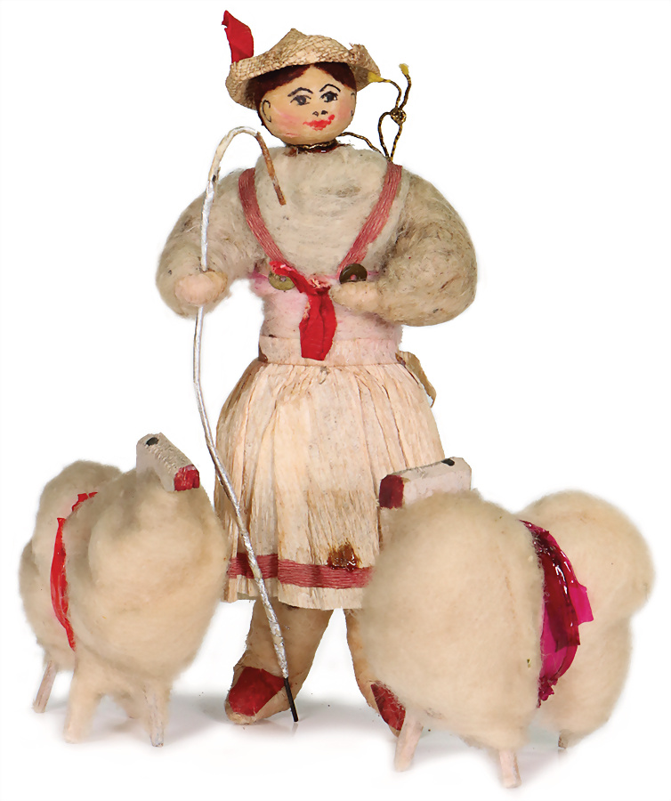 Christbaumschmuck, Watte, Krepp, Schäferin mit zwei Schafen, 12 cm