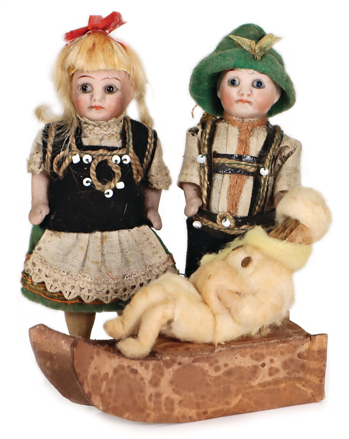Christbaumschmuck, Watte, Kinder, Hänsel u. Gretel, Pappschlitten, Kreppkleidung, Oblaten-Gesichter, H: 7-9 cm