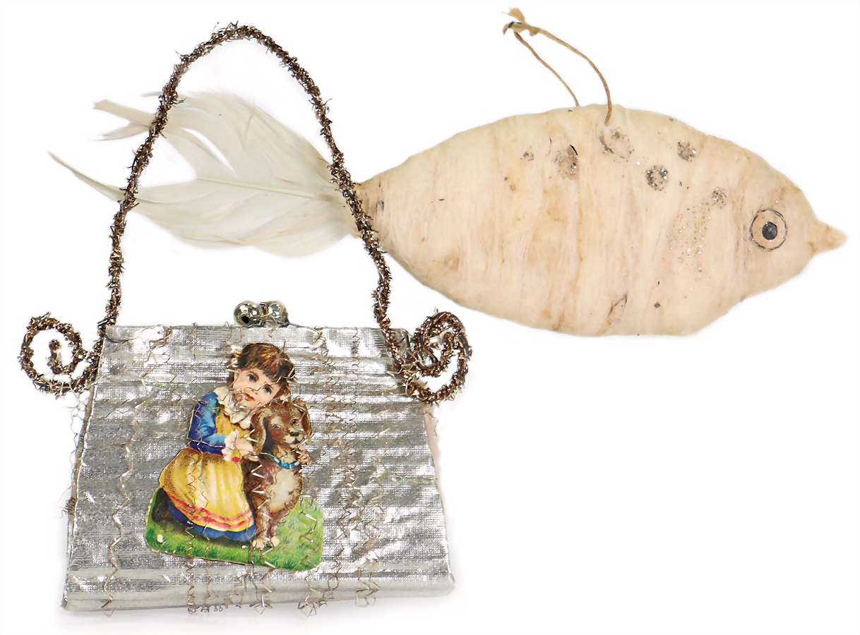 Christbaumschmuck, Watte-Fisch, Feder-Flosse, L: 15 cm, 1 x Christbaumschmuck-Tasche, mit Oblaten-Motiv