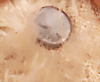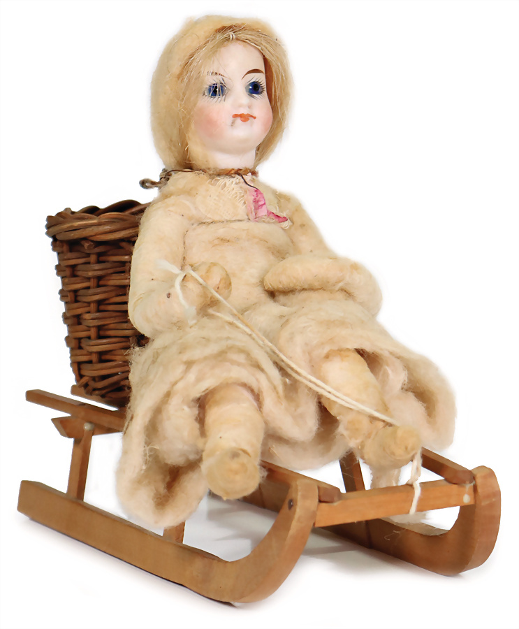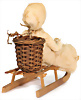 Weihnachtsschmuck, rodelndes Watte-Kind mit Porzellan-Kopf, mit kleiner Watte-Schneekugel, fest einges. Glasaugen, geschl., Mund, L: 19 cm, H: 14 cm