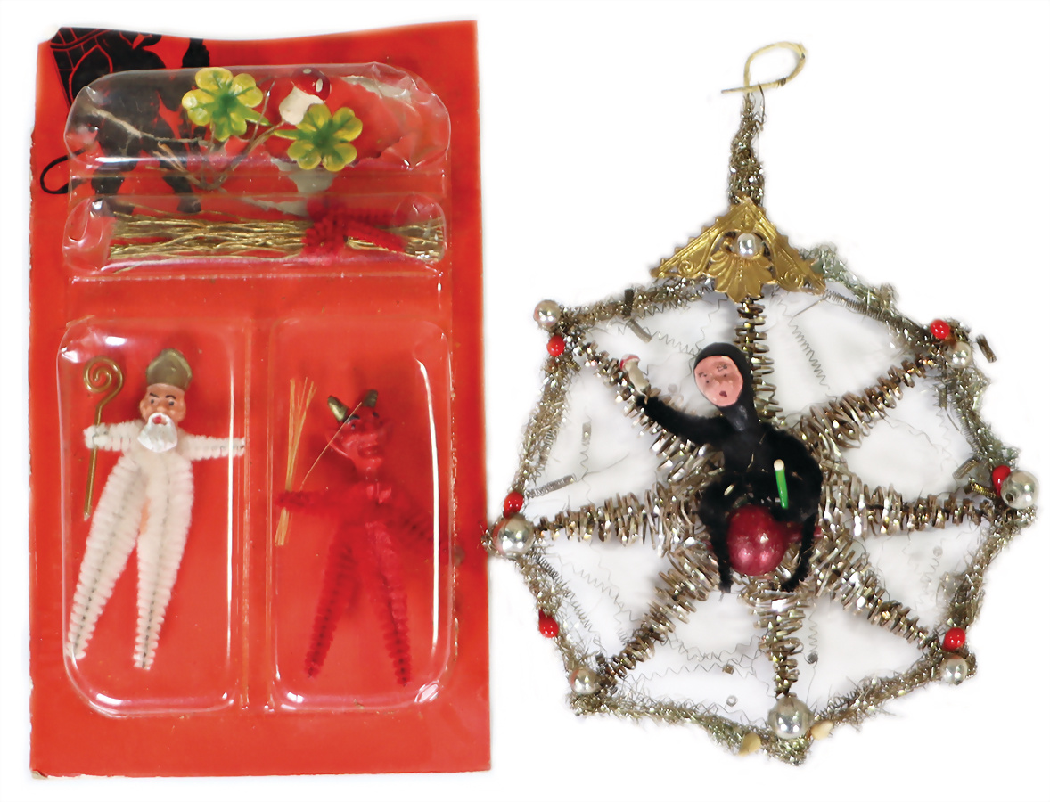 Konv. Weihnachtschmuck Krampus mit Rute, Kleeblätter und Fliegenpilz, dazu leonischer Draht-Stern, Chenille, dm: 16 cm, im Orig.-Zustand, selten