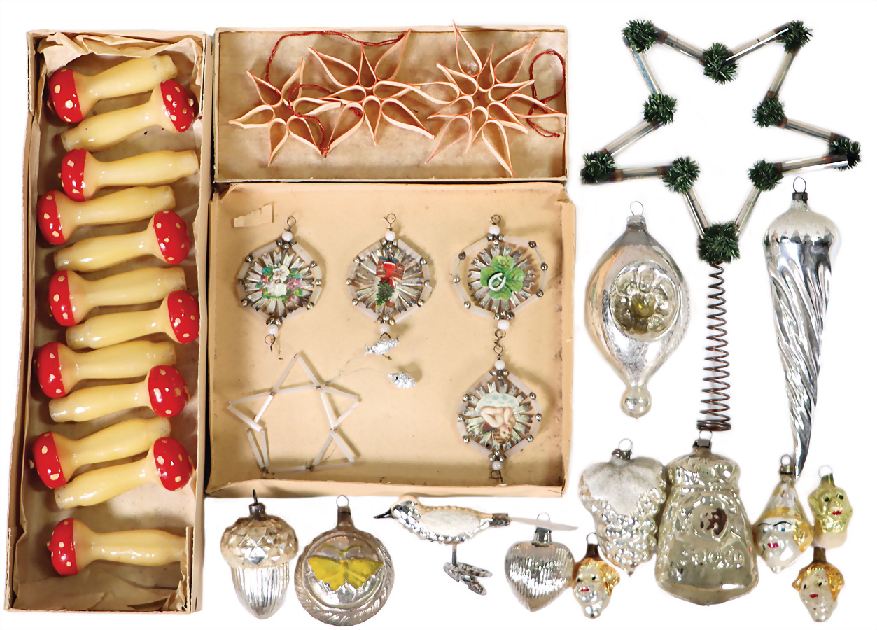 Konv. Weihnachtsschmuck, 6 x Miniatur-Glasschmuck mit unterschiedlichen Gesichtern, 6 x Holz-Span-Sterne, 1 Spitze-Stern 21 cm, 12 x Wachs-Kerzen, Fliegenpilze 7 cm, alle im Orig.-Karton