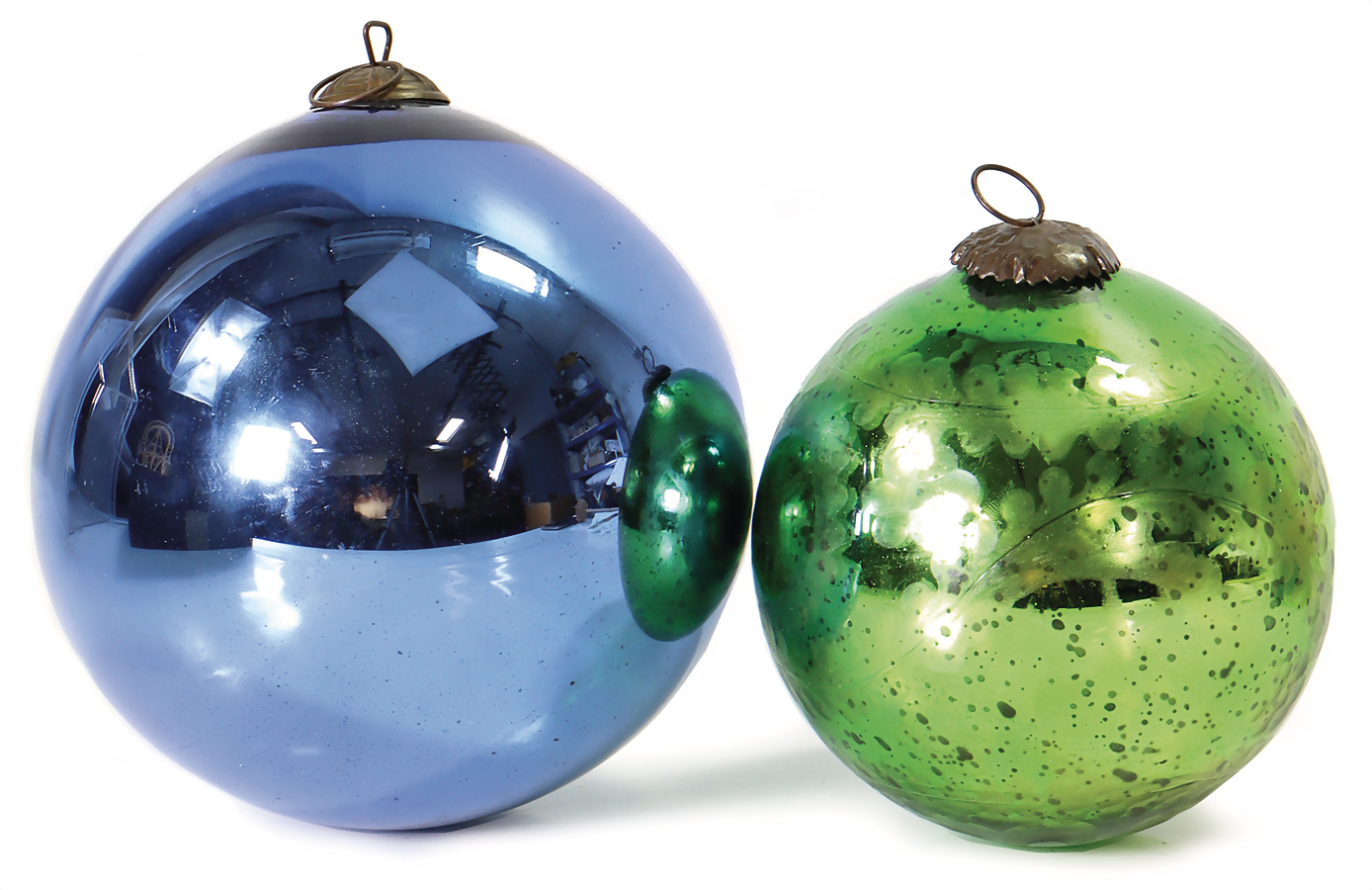 2 x Biedermeier Glaskugeln, blau DM: 16 cm, grüne Glaskugel mit Blatt-Einschlüssen, DM: 13 cm