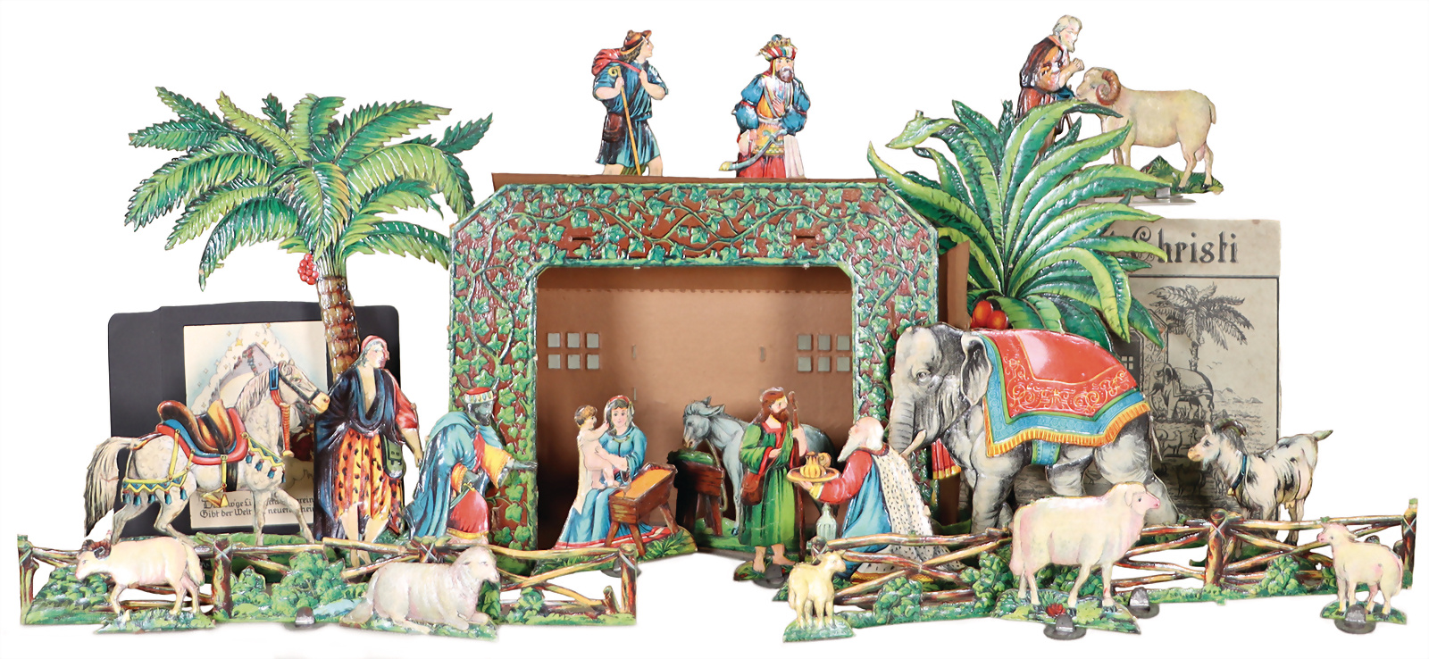 Krippe, die Geburt Christi, wohl Dresden, flach, Pappe geprägt, bunt lithogr., Figuren, H: 10 cm