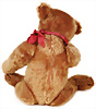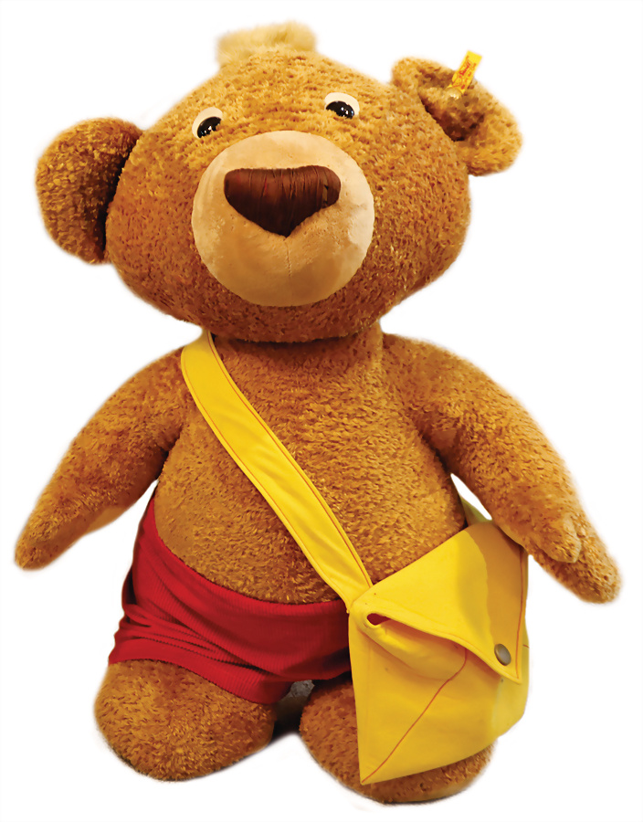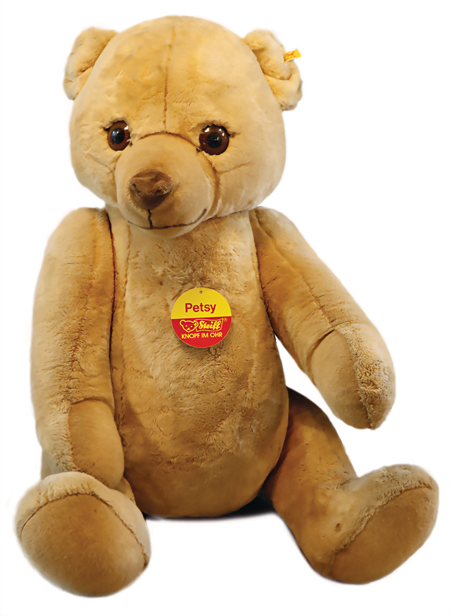 Petsy, Studiobär, Sitzhöhe 145 cm, kompl., Knopf, Schild u. Fahne, gr. Kunststoffaugen, ein wenig verkratzt, ein wenig eingestaubt, sonst guter Zust., ausgefallen