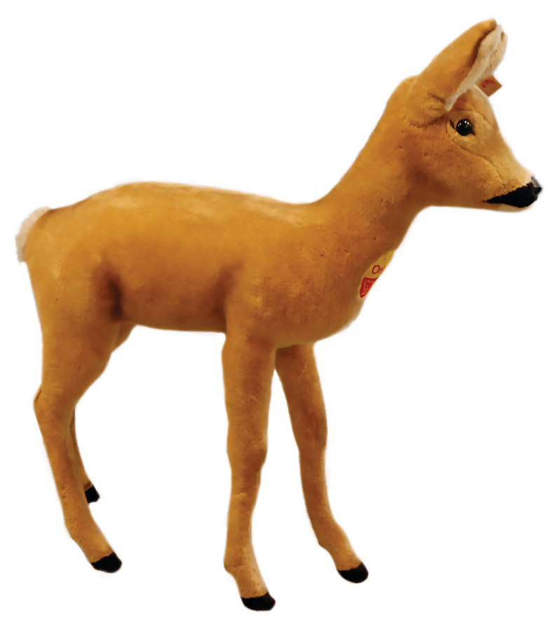 Studiotier, Rehkitz, H: 104 cm, L: 90 cm, mit Knopf u. Fahne, mit Brustschild, fest aufgenäht, guter Zust. , nur an Selbstabholer