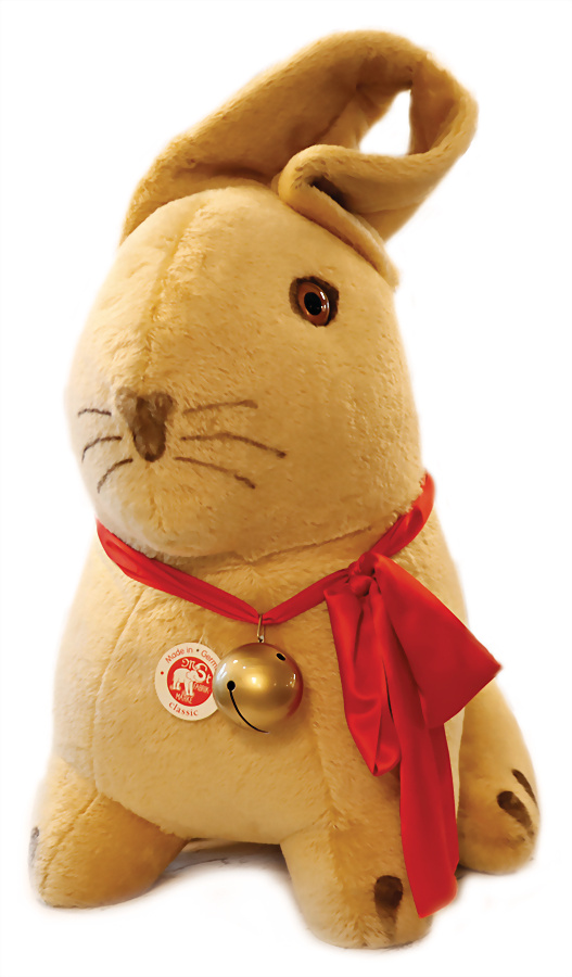 Schaufensterdekoration, Werbefigur, gr. Lindt-Hase, gr. goldener Knopf, mit Schild, mit Schleife u. Glocke, H: 102 cm, wenig eingestaubt, guter Zust., nur an Selbstabholer