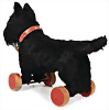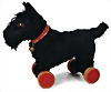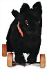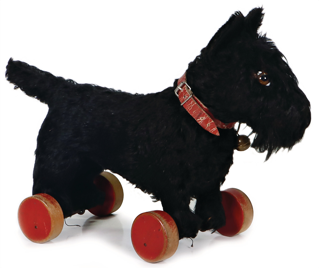 Scotty, Bell-Hund, hergestellt 1939-1942, auf Exzenterräder, farbliche Abriebstelle an den Rädern stehend, schwarzes Mohair, mit Knopf, langgezogenes f, ohne Fahne, kleine kahle Stelle am linken Auge, orig. Lederhalsband mit Glocke