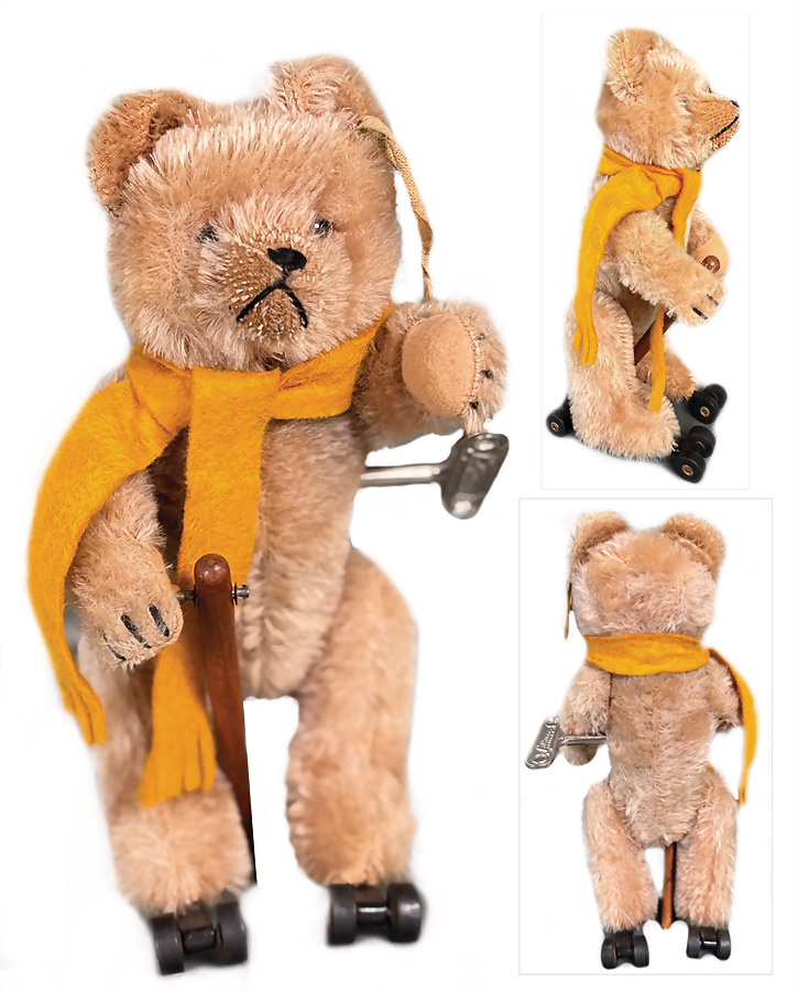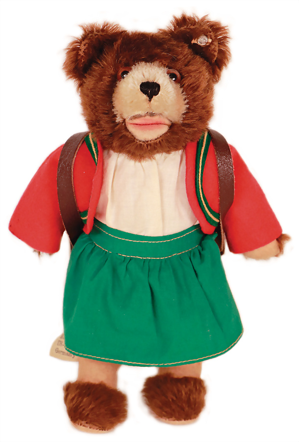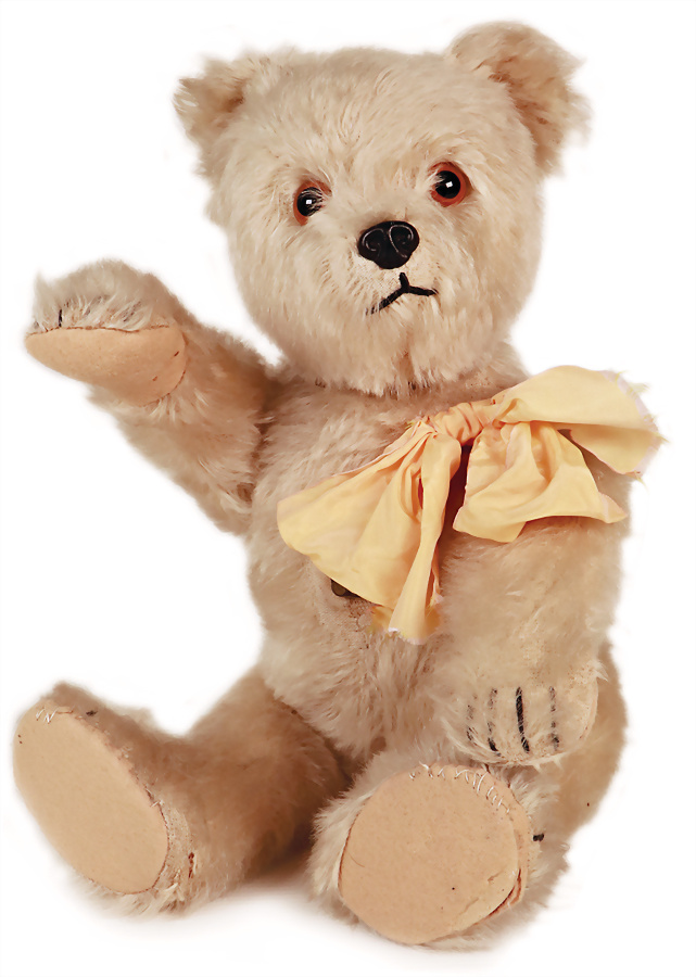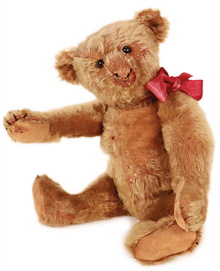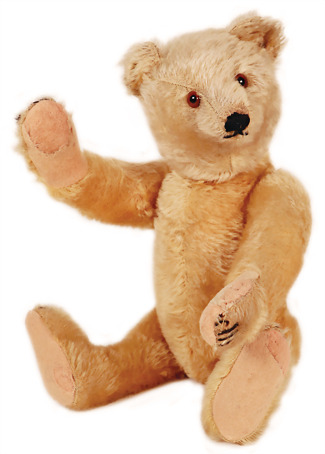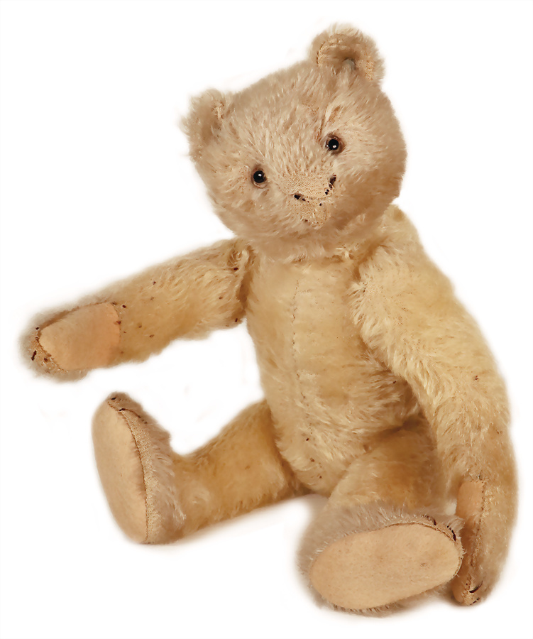 Bär, ca. 1915, 32 cm, mit Knopf, langgezogenes f, Schuhknopfaugen, Mohair an kl. Stellen abgeliebt, kl. Filzfehler, Nasenbestickung berieben, insges. guter Zust., das Objekt befindet sich in der Schweiz, diese Artikel können abgeholt oder versandt werden, bei Einfuhr in die EU fallen Zoll u. Umsatzsteuer an, eine Verzollung kann auch persönlich vorgenommen werden, für Bieter außerhalb der EU gelten die dort üblichen Zollbedingungen