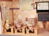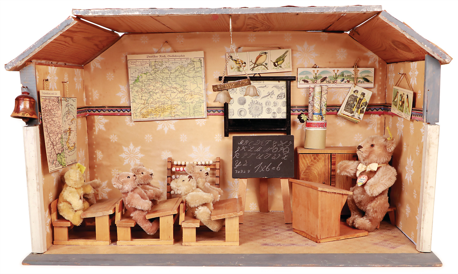 Bärenschule, B: 53 cm, H: 31,5 cm, Schulbänke, Lehrerpult, Zubehör, mit 50er Jahre Bären (Orig.-Teddy), 7 Teile, 9 cm, meist mit Knopf, Reste der Fahne, 1 Orig.-Teddy, 14 cm, Knopf, Schild u. Fahne, Fahne verschlissen, das Objekt befindet sich in der Schweiz, diese Artikel können abgeholt oder versandt werden, bei Einfuhr in die EU fallen Zoll u. Umsatzsteuer an, eine Verzollung kann auch persönlich vorgenommen werden, für Bieter außerhalb der EU gelten die dort üblichen Zollbedingungen