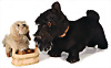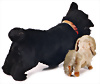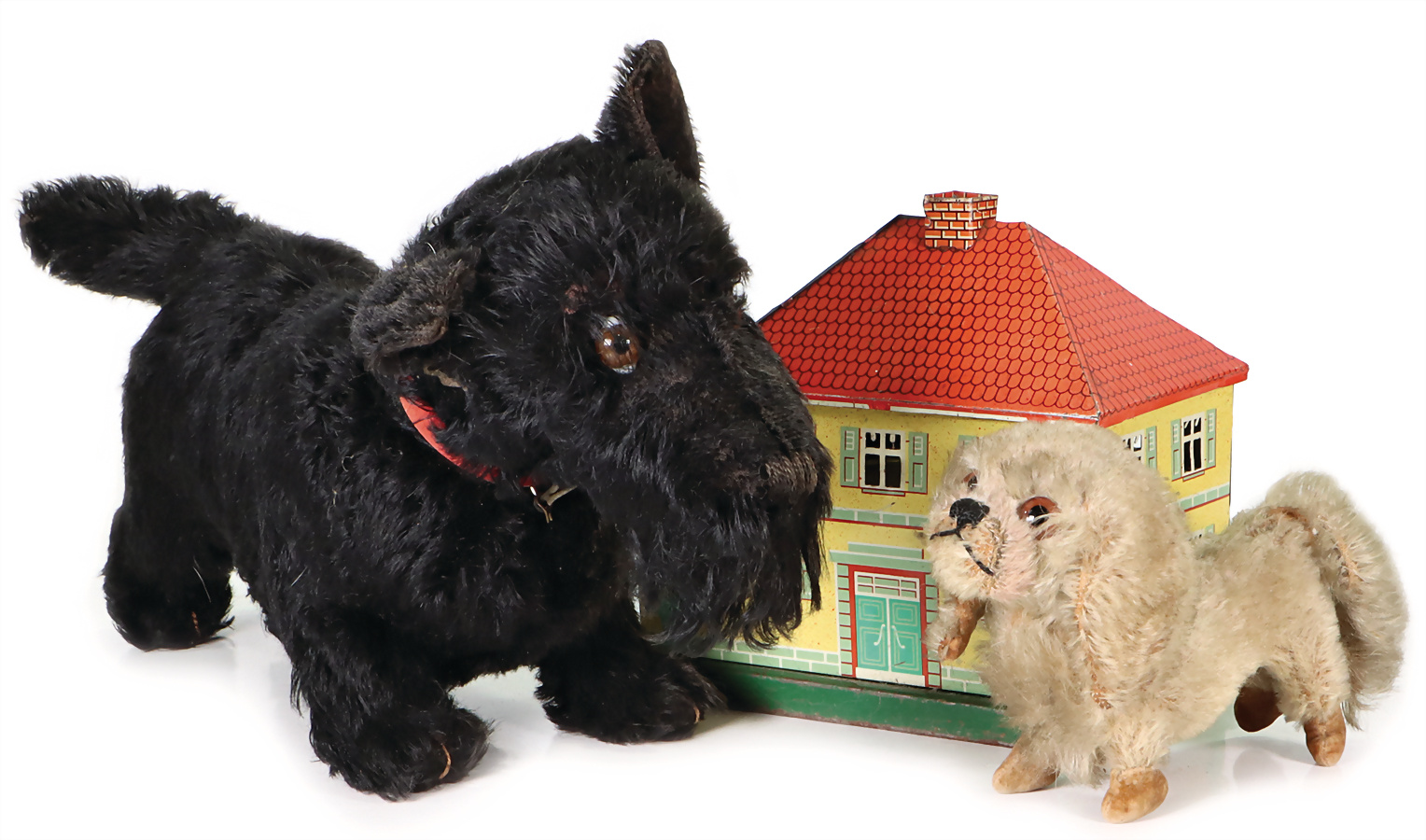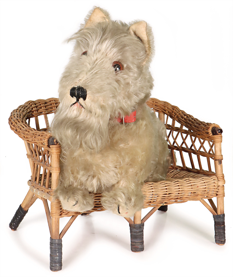 Steiff, 2 Teile, 1 x Scotty, hergestellt 1934, stehend, mit Knopf, langgezogenes f, teilweise schwarze Lasierung zu erkennen, H: 22 cm, an einem Ohr Naht etwas locker, dazu kl., Chin Chin, hergestellt 1931-1939, farblich stärker ausgeblichen, sowie Mohair-Verlust, H: 11 cm