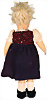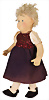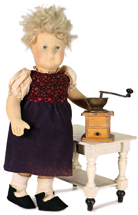 Filzpresskopf-Puppe, weicher Körper, 42 cm, hergestellt um 1940, blaue fest eingesetzte Glasaugen, eingesetztes lockiges Mohair-Haar, Filzkörper, Schlenker Arme, bewegliche Beine, vermutlich orig. Kleid, fehlende Schürze, Airbrush etwas ausgeblichen